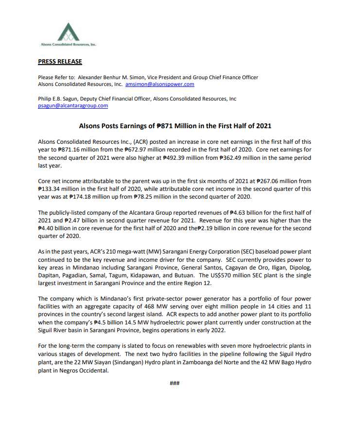ACR Press Release: Alsons Posts Earnings of 871 Million in the First Half of 2021