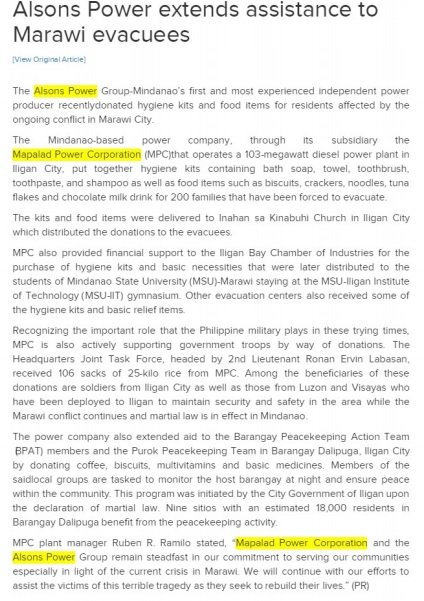 The Alsons Power Group-Mindanao’s first and most experienced independent power producer recentlydonated hygiene kits and food items for residents affected by the ongoing conflict in Marawi City.