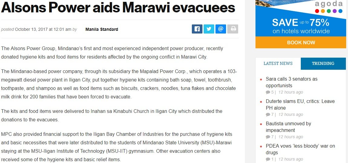 The Alsons Power Group, Mindanao’s first and most experienced independent power producer, recently donated hygiene kits and food items for residents affected by the ongoing conflict in Marawi City.