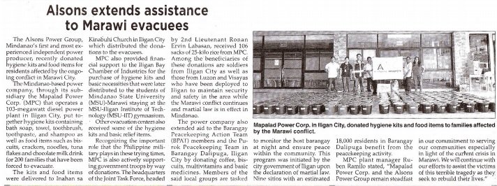 The Alsons Power Group, Mindanao's first and most experienced independent power producer recently donated hygiene kits and food items for residents affected by the ongoing conflict in Marawi City
