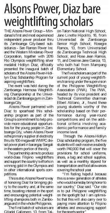THE Alsons Power Group-Mindanaos first and most experienced independent power producer thru its Zamboanga City-based subsidiaries - San Ramon Power. Inc. and the Western Mindanao Power Corporation, together with 2016 Rio Olympics weightlifting silver medalist Hidilyn Diaz, officially presented the inaugural batch of scholars of the Alsons Power-Hidilyn Diaz Scholarship Program for aspiring weightlifters.