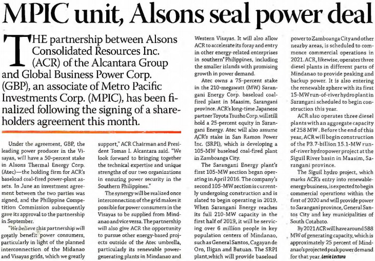 THE partnership between Alsons Consolidated Resources Inc. (ACR) of the Alcantara Group and Global Business Power Corp. (GBP), an associate of Metro Pacific Investments Corp. (MPIC), has been finalized following the signing of a shareholders agreement this month.