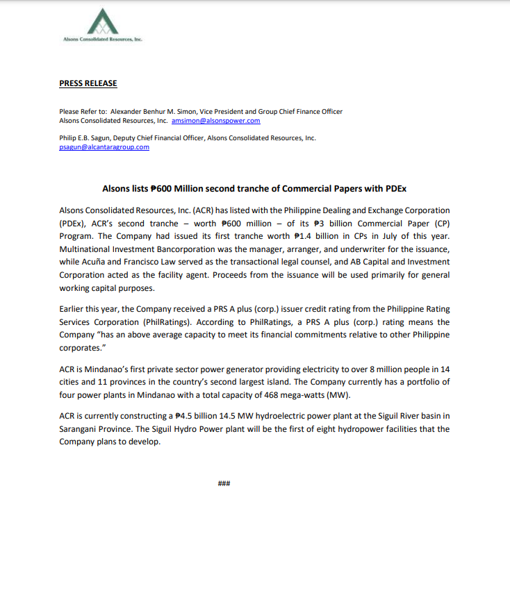 ACR Press Release: Alsons lists 600 Million pesos second tranche of Commercial Papers with PDEx