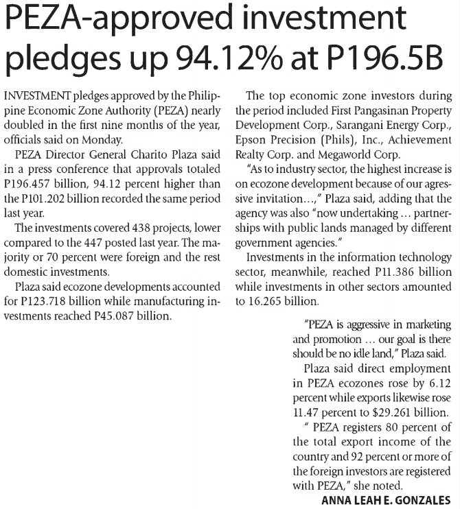 PEZA-approved investment pledges up 94.12% at P196.5B