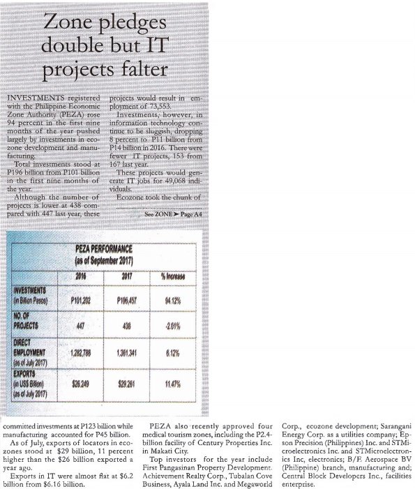 INVESTMENTS registered with the Philippines Economic Zone Authority (PEZA) rose 94 percent in the first nine months of the year pushed largely by investments in ecozone development and manufacturing.