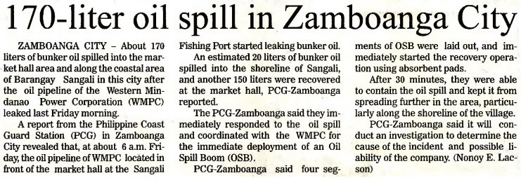 Zamboanga City – About 170 liters of bunker oil spilled into the market hall area and along the coastal area of Barangay Sangali in this city after the oil pipeline of the Western Mindanao Power Corporation (WMPC) leaked last Friday morning.