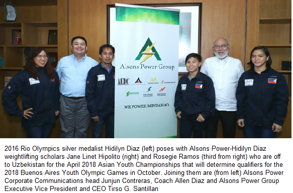 Two weightlifting scholars of the Alsons Power Group, Mindanao’s first and most experienced independent power producer, are bound for Urgench, Uzbekistan to compete in the 19th Asian Youth Championships from April 20 to 30, 2018.